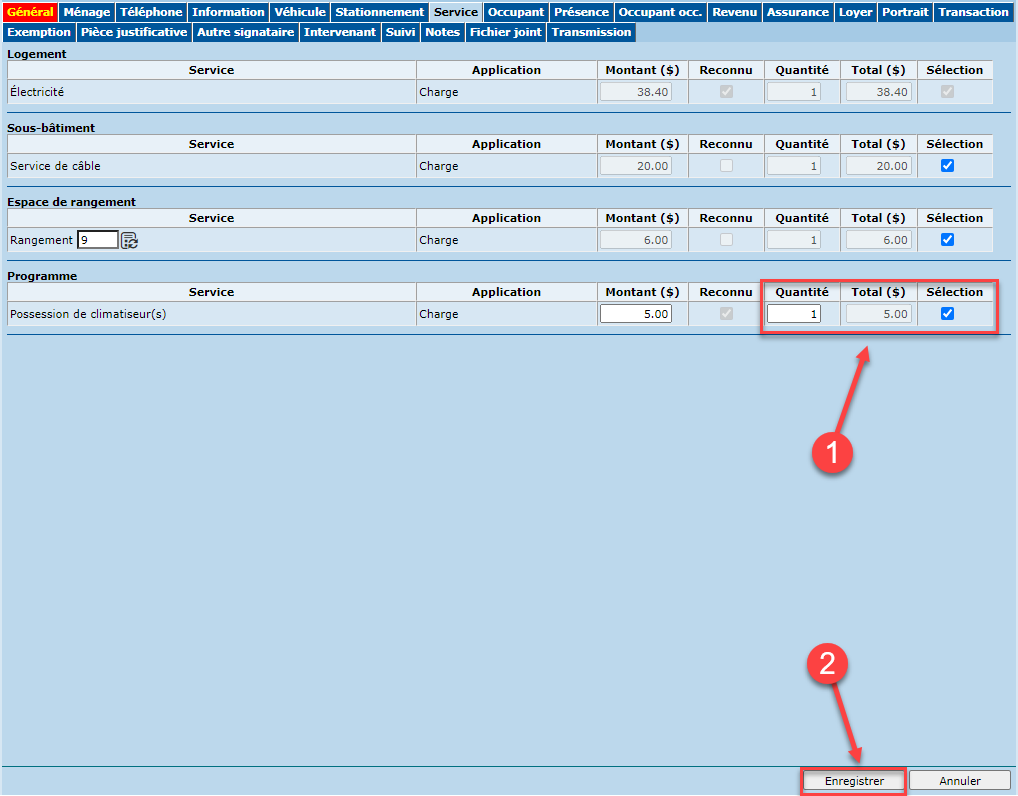 L'ajout / retrait d'un climatiseur s'effectue sous l'onglet "Service" de l'amendement modification de services.