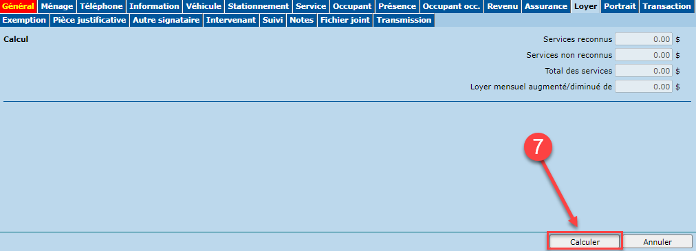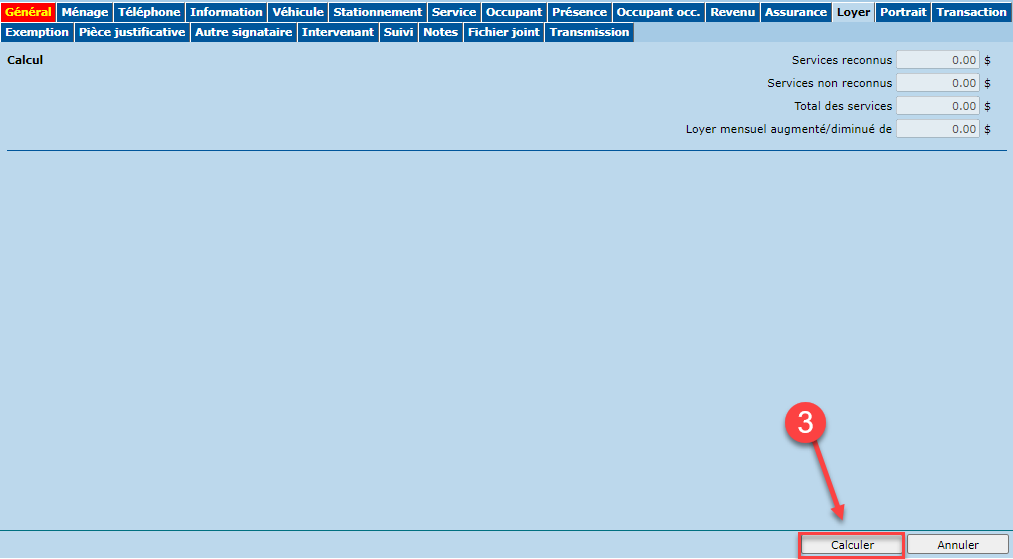 - Une fois le changement effectué, cliquer sur le bouton "Calculer" sous l'onglet "Loyer" pour calculer le bail en fonction des nouveaux changements.