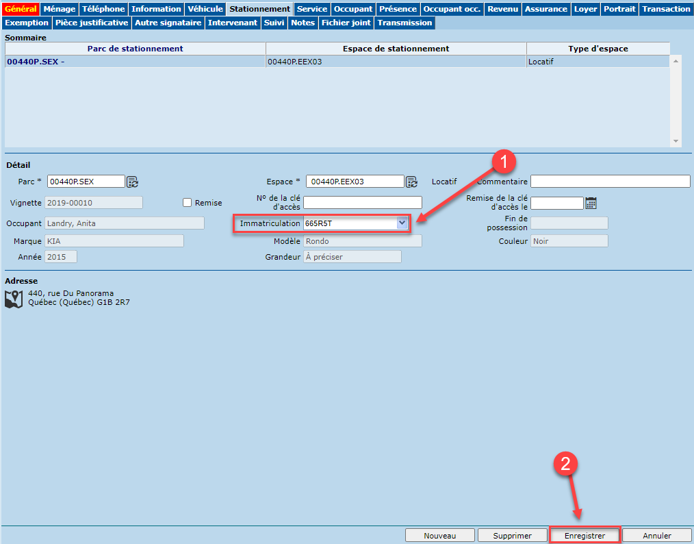 Pour ajouter un stationnement à un bail, un véhicule doit être associé au ménage.