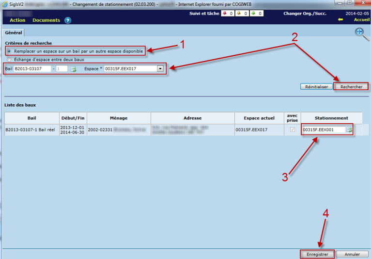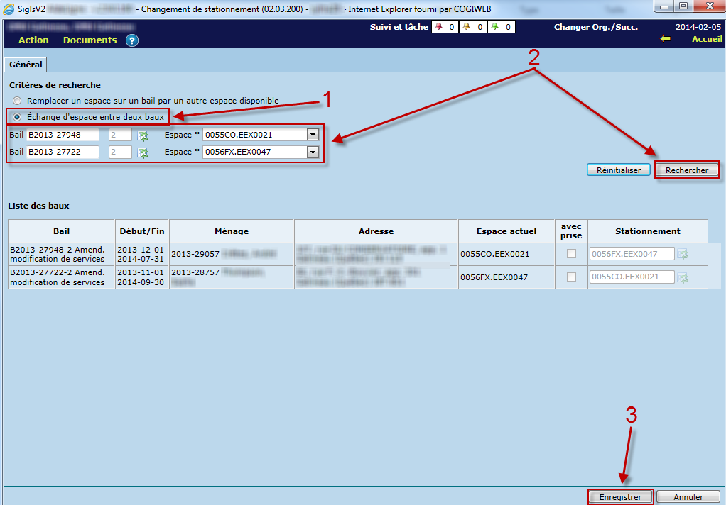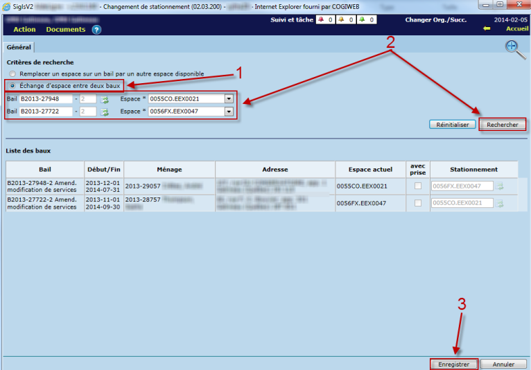 - Sélectionner les baux ainsi que les espaces de stationnement, puis cliquer sur "Rechercher". Les baux s'afficheront dans la section "Liste des baux" avec les changements à effectuer.