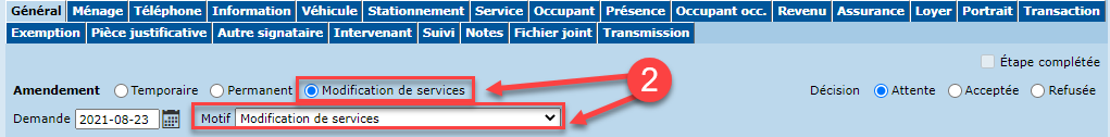 NOTE IMPORTANTE : L'amendement modification de services ne permet aucune modification au niveau des revenus ou de la composition du ménage. Pour effectuer de tels changements, vous devez créer un amendement permanent ou un amendement temporaire, selon le cas.