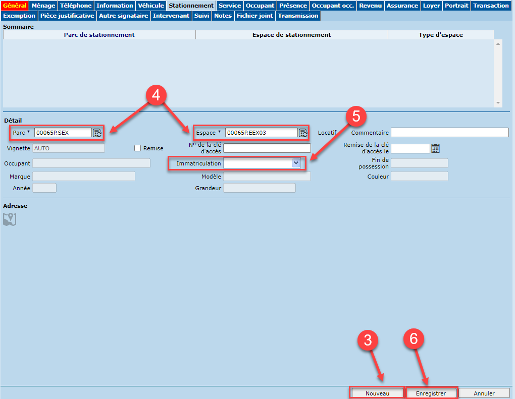 - À partir de l'onglet "Stationnement" du bail, cliquer sur "Nouveau".
