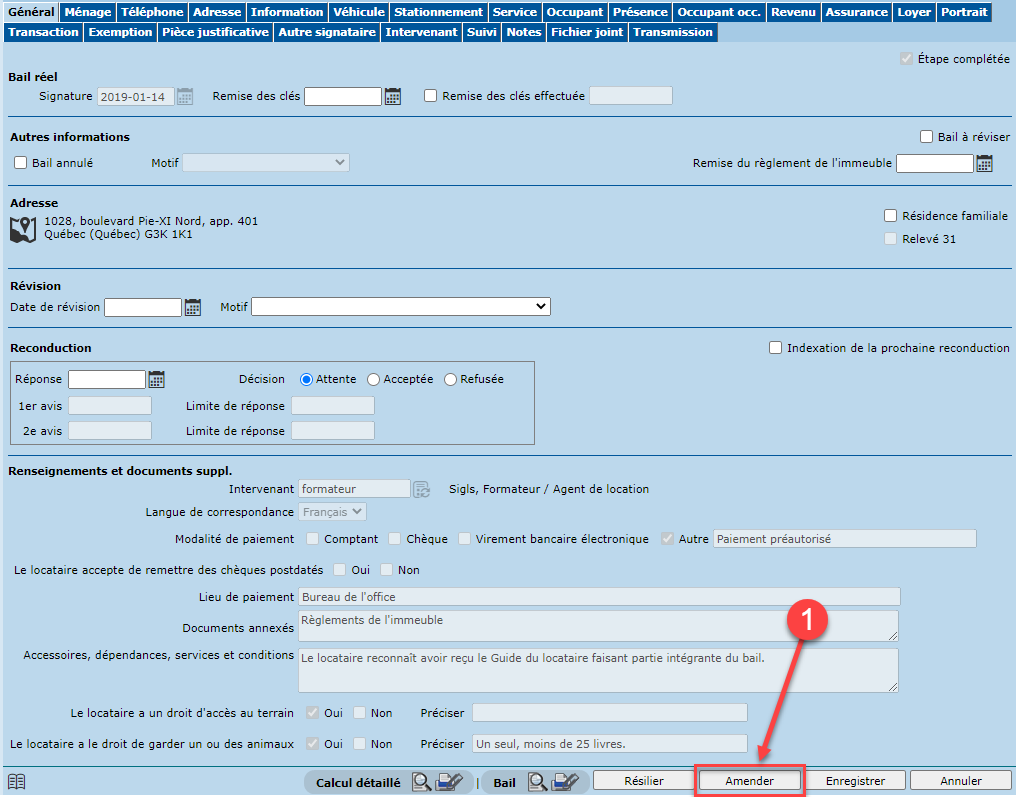 - À partir de l'onglet "Général" du bail, cliquer sur le bouton "Amender".