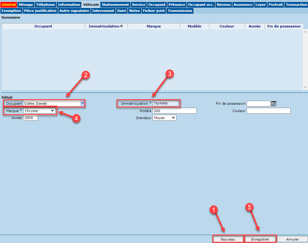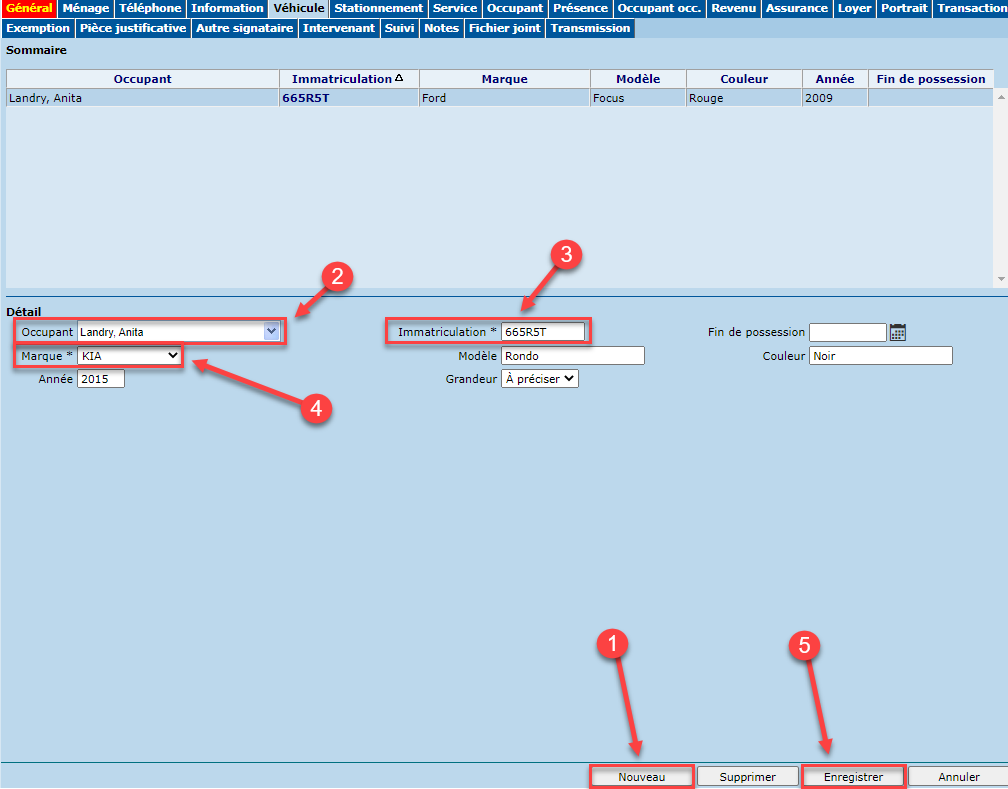 - À partir de l'onglet "Véhicule", cliquer sur le bouton "Nouveau".