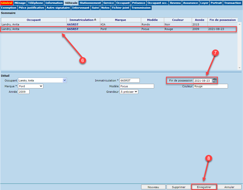 Il est recommandé de ne pas supprimer l'ancien véhicule, pour des fins d'historique.