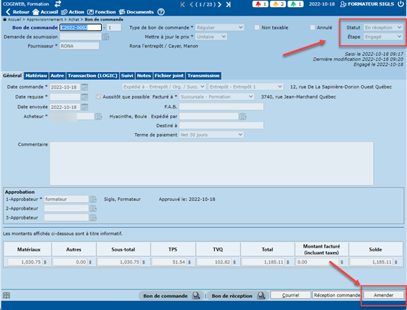 Amender un bon de commande