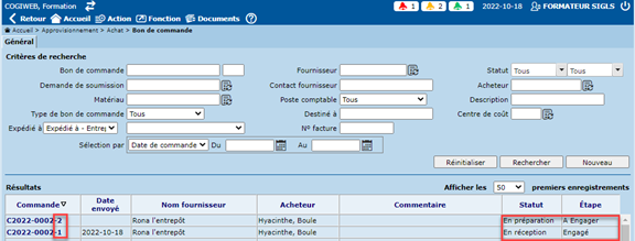 - Statut "En réception" et étape "Engagé" ou "En facturation;