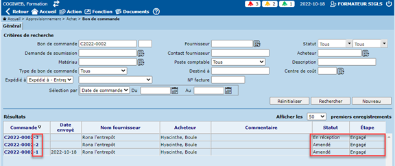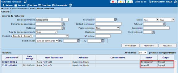 Le BC original passera au statut "Amendé" seulement au moment de l'envoi du nouveau BC ("-2") ou lorsque le bon de commande sera approuvé par tous les approbateurs (si la gestion des approbations est activée). Le BC original passera alors au statut "Amendé".