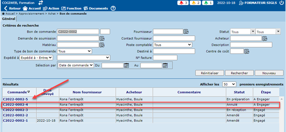 Ainsi, pour annuler un BC, il suffit de cocher la case "Annulé" lorsque cette dernière est disponible. Le statut du BC original (-1) retourne alors au statut auquel il se trouvait avant l'amendement, et la copie du BC (-2) passe du même coup au statut "Annulé".