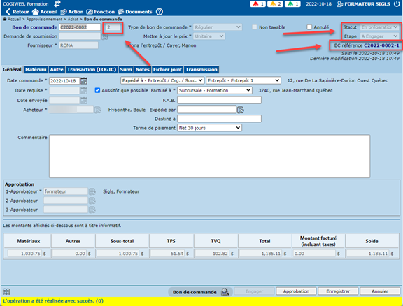 Du côté du nouveau BC, ce dernier doit être considéré comme un BC nouvellement créé pour lequel il faudra effectuer les étapes d'approbation (au besoin) et l'envoi au fournisseur (au besoin).