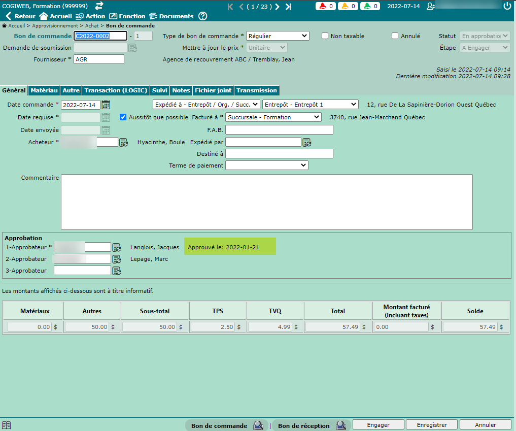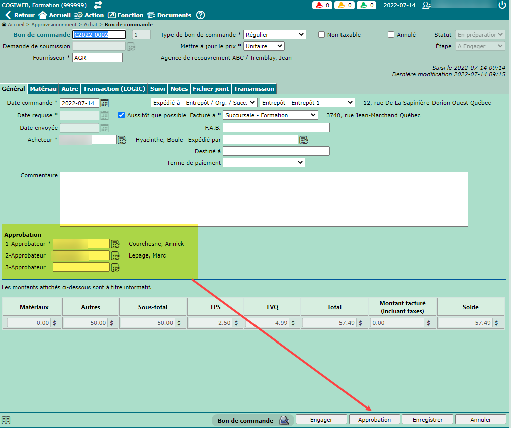 2. Le préparateur soumet le bon de commande pour approbation en cliquant sur le bouton "Approbation" de l'écran (statut "En approbation"). Le bouton "Approbation est disponible sous les onglets "Général", "Matériau" et "Autre" de l'écran "Bon de commande".