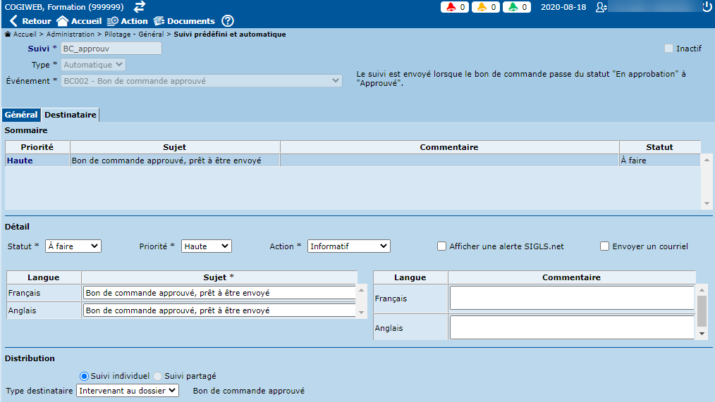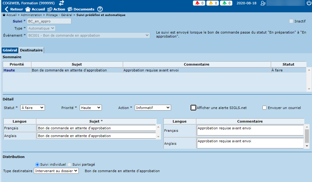 Si désiré, il est possible de créer des suivis automatiques lorsque le bon de commande est en approbation ou lorsqu'il est approuvé.