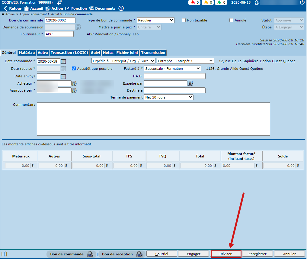 À noter que le préparateur peut également réviser le bon de commande lorsque celui-ci est approuvé, et ce, afin de modifier s'il y a lieu des informations contenues dans celui-ci, en cliquant sur le bouton "Réviser". Dans ce cas, le bon de commande passera à nouveau au statut "En préparation" et devra être à nouveau approuvé selon le même principe afin de valider les informations avant l'envoi.