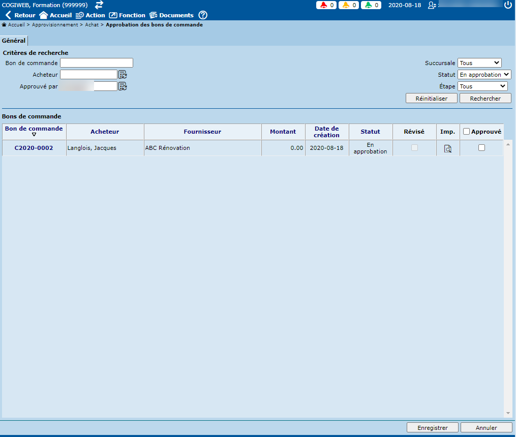 3. Le ou les approbateurs, informés via le suivi BC001 si piloté selon la procédure ci-haut, approuve le bon de commande à partir de l'écran "Approbation des bons de commande" (statut "Approuvé");