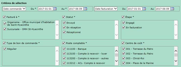 L’ensemble de ces critères sont présélectionnés afin de répondre à la définition d’un « Engagement », ils peuvent également être décochés afin de cibler une organisation, un poste comptable et/ou un centre de coût.
