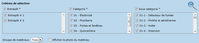 La liste des matériaux permet de spécifier les critères suivants :