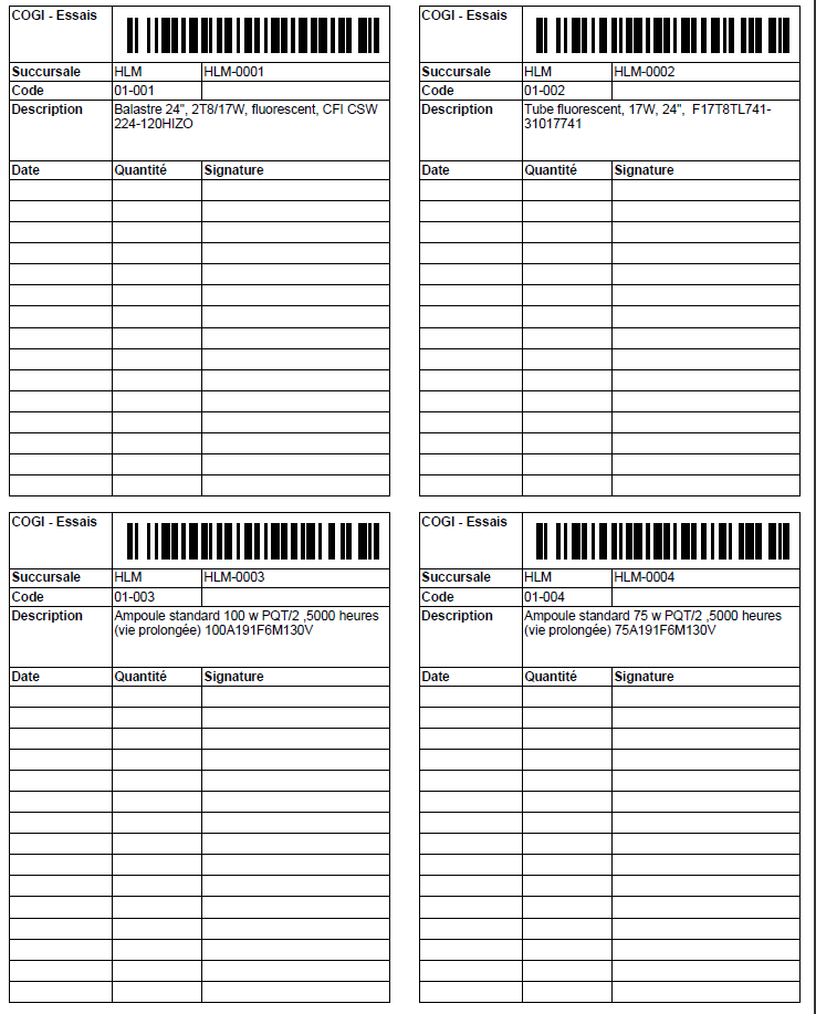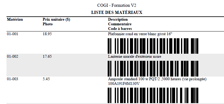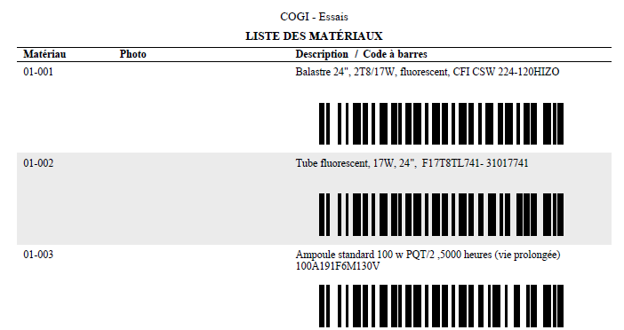Le format sommaire fournit les informations de base ainsi qu'un code à barres pour chaque matériau.