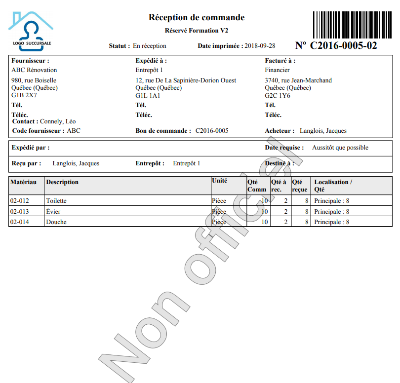 Le bon de réception de commande affiche tous les matériaux commandés, les quantités reçues et à recevoir, ainsi que la localisation du matériel selon la séquence de réception.