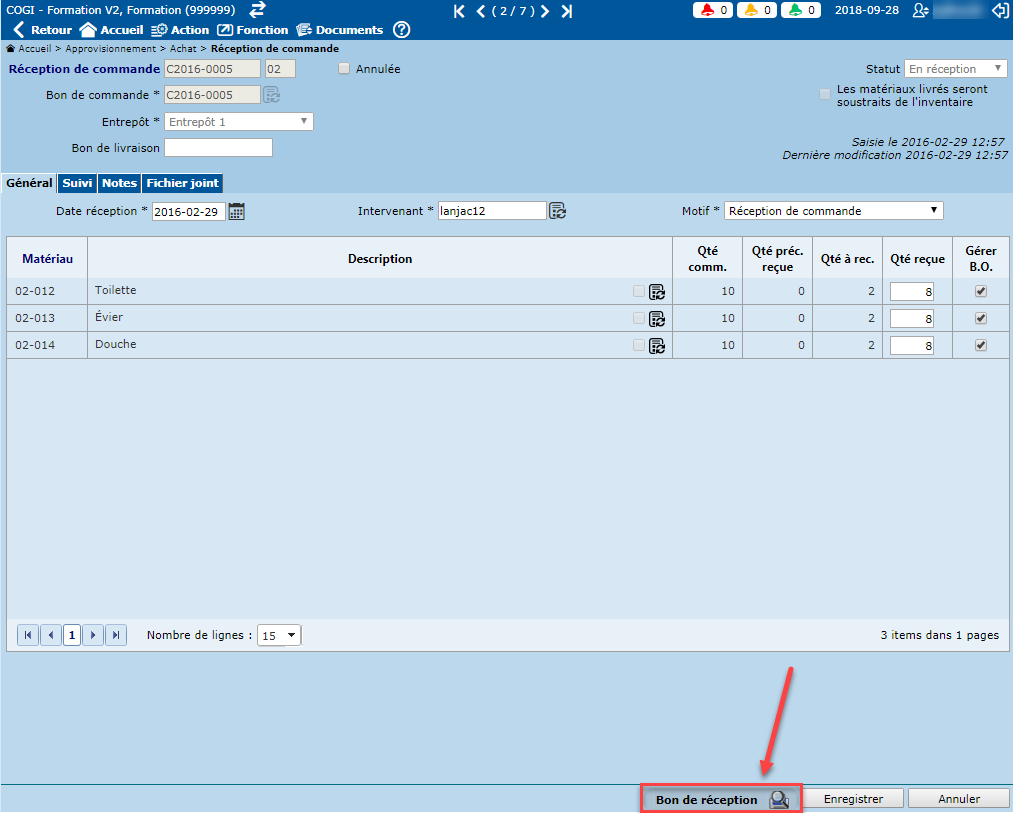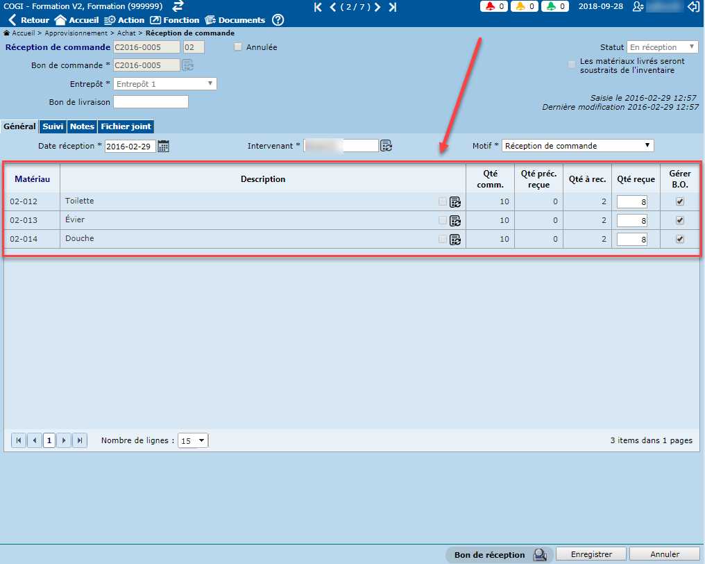 - Le champ "Qté reçue" est obligatoire. Ce champ permet d'indiquer la quantité de matériaux reçue.