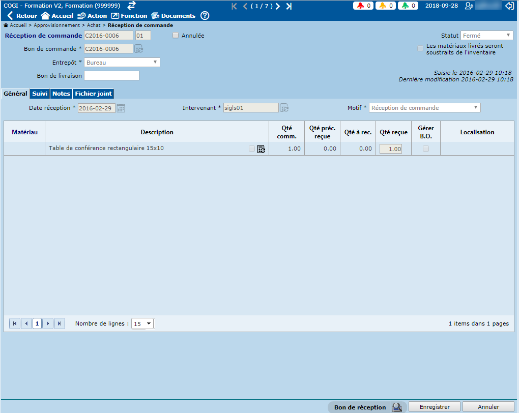 - Le champ "Intervenant" est obligatoire. Ce champ permet d'indiquer la personne qui effectue la saisie de la réception de commande.