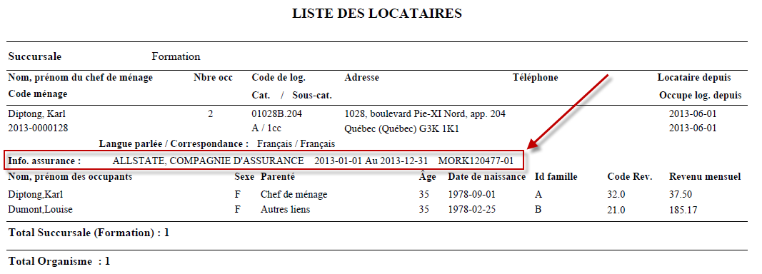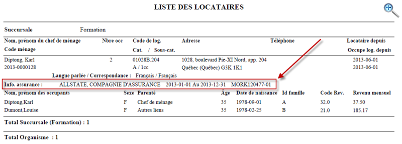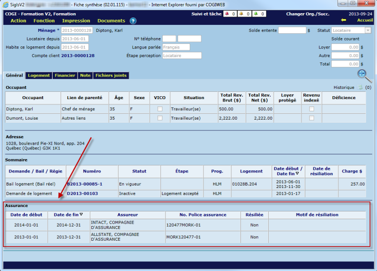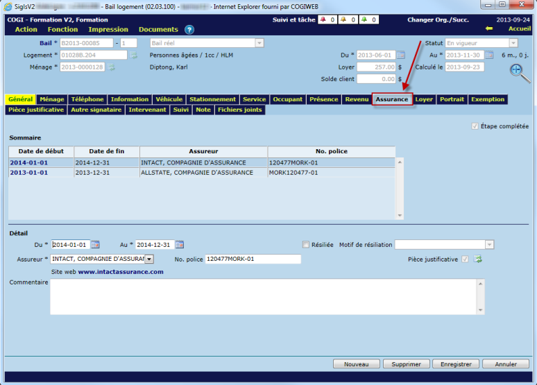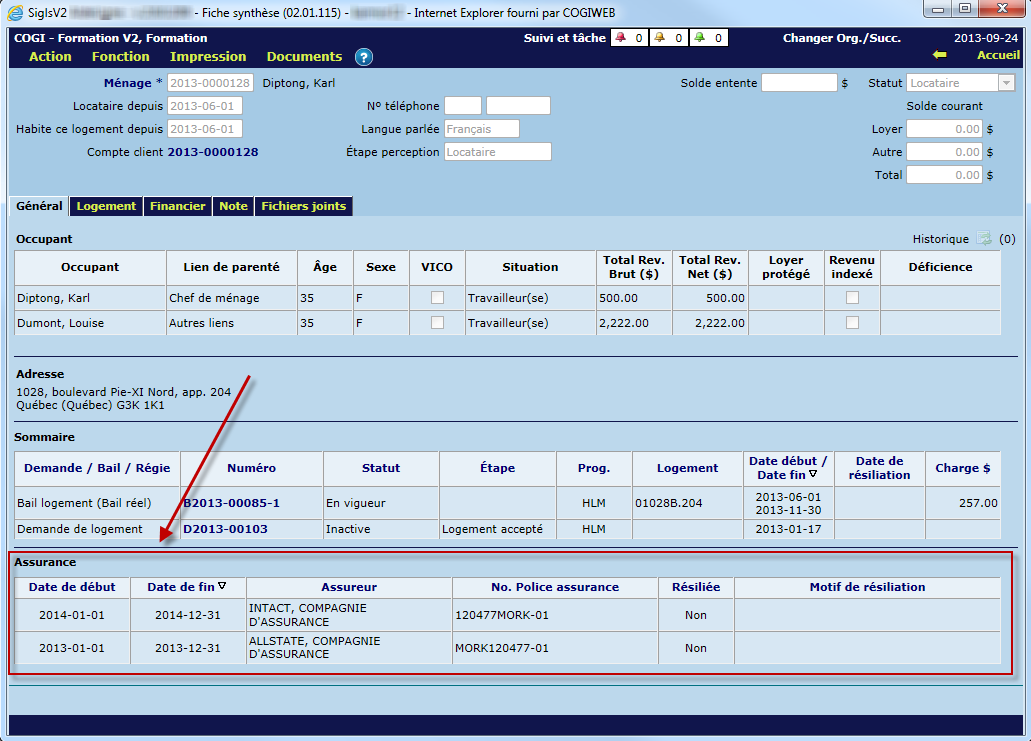 L'information sur l'assurance-habitation du locataire est disponible à plusieurs endroits dans le SIGLS :