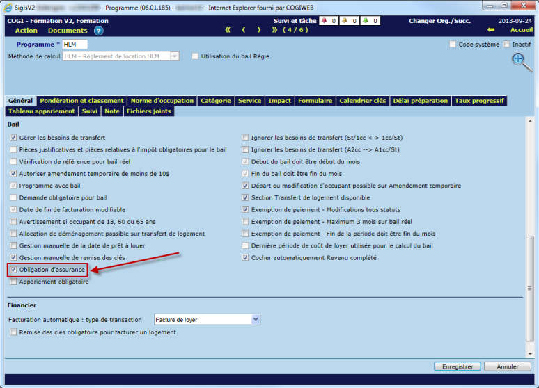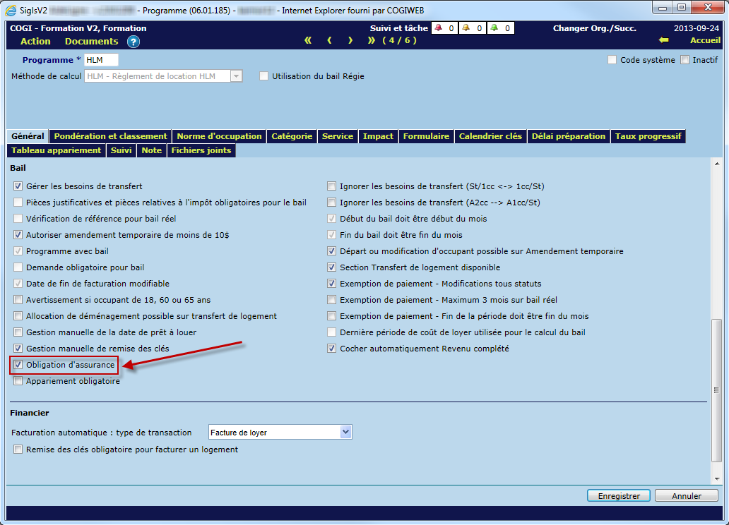 - Cette case à cocher permet de définir, pour un programme en particulier, si l'information sous l'onglet "Assurance" doit être complétée afin que le bail puisse devenir en vigueur.