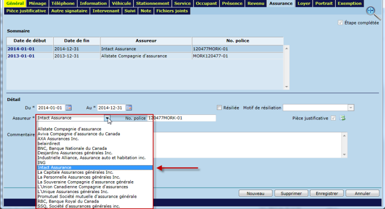 - La liste déroulante "Assureur" permet de sélectionner la compagnie d'assurance du locataire. Une liste de 20 assureurs a été préalablement créée. Au besoin, il est possible d'ajouter des compagnies d'assurance via l'écran "Intervenant externe".