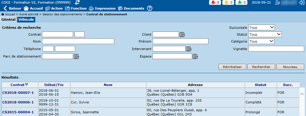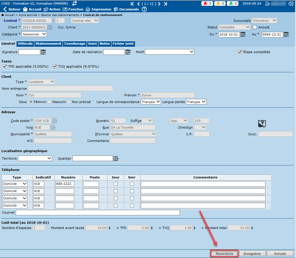 Un contrat de stationnement peut être un "Contrat réel" ou une "Reconduction". Essentiellement, le contrat réel constitue le premier contrat (séquence 1), et tous les contrats subséquents constituent des reconductions. Ceux-ci sont créés via le bouton "Reconduire", situé dans le contrat de stationnement.