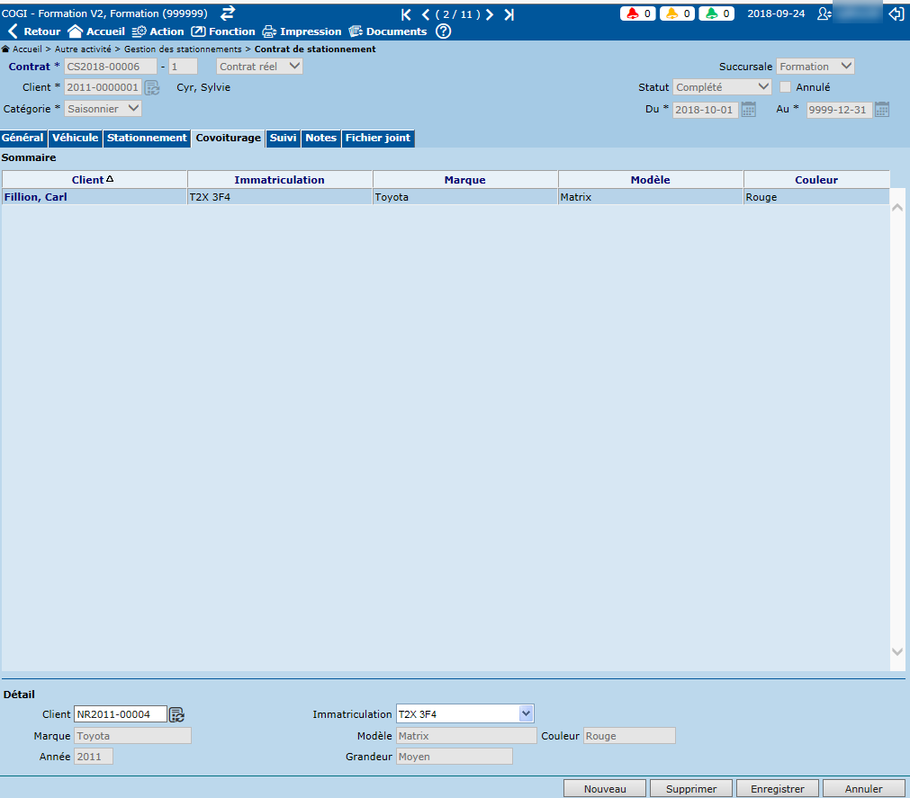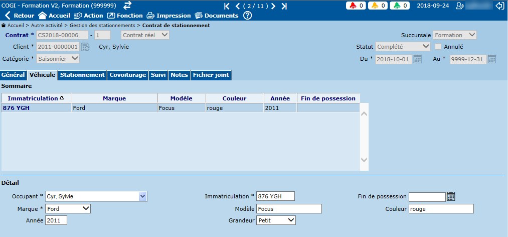 Cet écran permet de consulter, enregistrer et modifier les informations relatives à un contrat de stationnement.