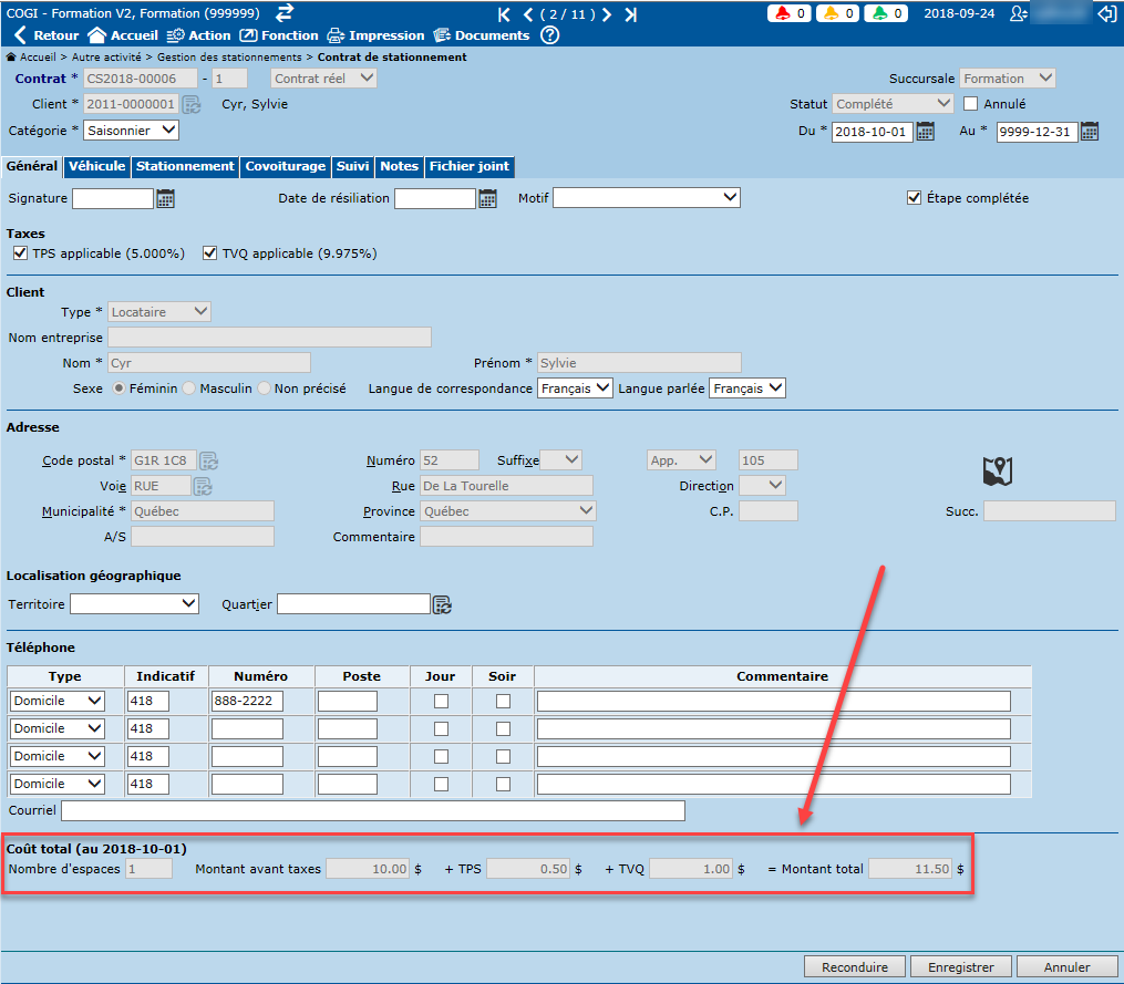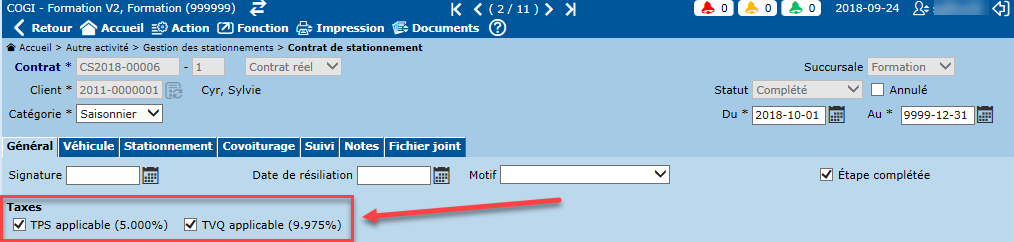 Il est possible d'appliquer ou non les taxes de vente sur un contrat de stationnement lors de la création de ce dernier.