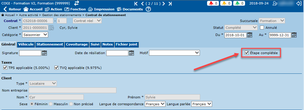 | Complété | Un contrat de stationnement est complété lorsque celui-ci contient un ou plusieurs espaces de stationnement et un service, et que la case "Étape complétée" est cochée, sans toutefois être signé. |