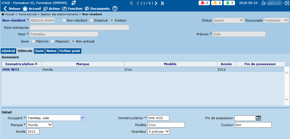 L'onglet "Véhicule" permet d'ajouter le ou les véhicules du non-résident, s'il y a lieu.