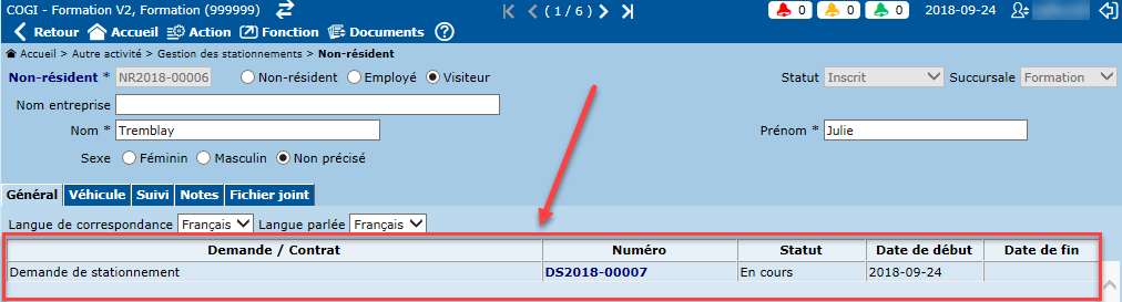 Si le non-résident possède une demande ou un contrat de stationnement, un tableau affichant les informations relatives à la demande ou au contrat s'affiche sous l'onglet "Général".