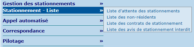 La section "Stationnement - Liste" contient une série de listes qui concernent les stationnements, les non-résidents et les contrats de stationnement..