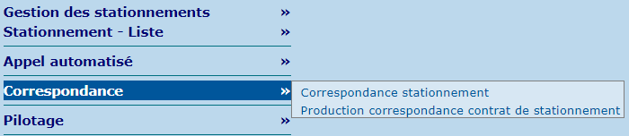 La section "Correspondance" contient une série d'écrans permettant de produire des correspondances concernant les stationnements.