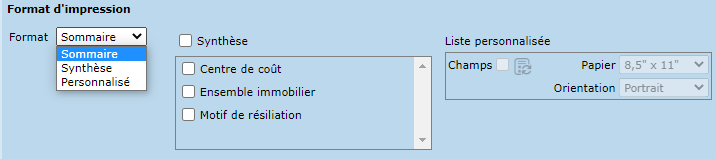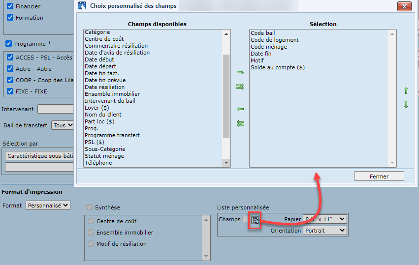 Le format personnalisé permet de définir les champs à afficher dans la liste, et offre ainsi plus de flexibilité. Pour ce faire, il suffit de cliquer sur la liste de valeurs, et déplacer les champs désirés dans la liste des champs disponibles vers la liste "Sélection" à l'aide des flèches prévues à cet effet.