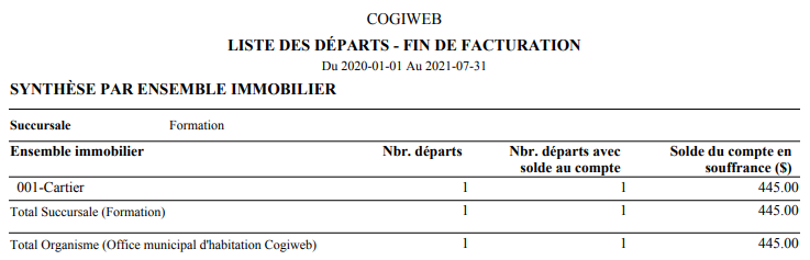 Le format synthèse présente un résumé des informations selon divers critères. La liste des départs - Fin de facturation présente les synthèses suivantes :