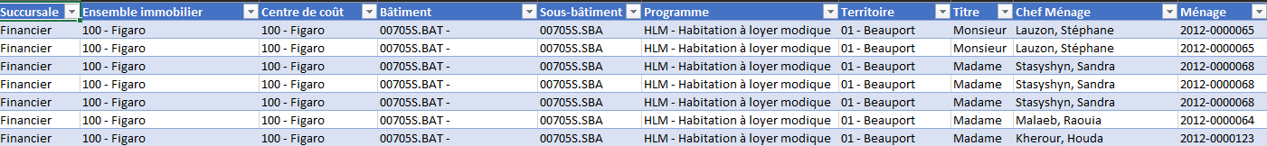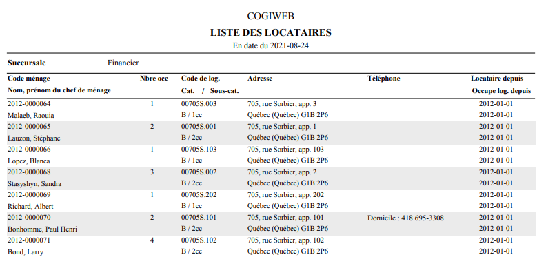 Le format sommaire fournit les informations de base pour chaque locataire.