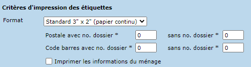 Pour générer une série d'étiquettes en fonction des critères de recherche sélectionnés, il suffit de cliquer sur le bouton "Étiquette". Par ailleurs, il est possible de générer une liste de ménages en fonction des critères de recherche sélectionnés en cliquant sur le bouton "Imprimer".