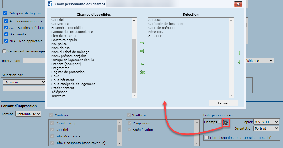 Le format personnalisé permet de définir les champs à afficher dans la liste, et offre ainsi plus de flexibilité. Pour ce faire, il suffit de cliquer sur la liste de valeurs, et déplacer les champs désirés dans la liste des champs disponibles vers la liste "Sélection" à l'aide des flèches prévues à cet effet.