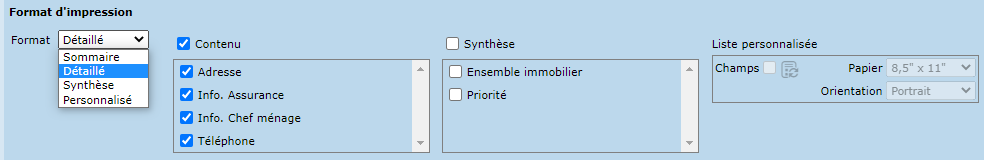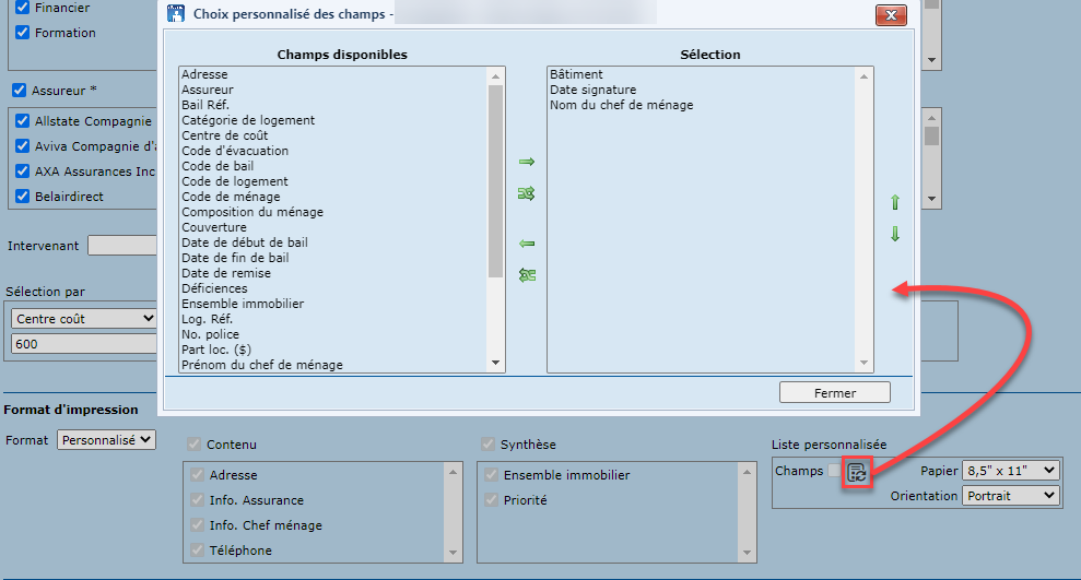 Le format personnalisé permet de définir les champs à afficher dans la liste, et offre ainsi plus de flexibilité. Pour ce faire, il suffit de cliquer sur la liste de valeurs, et déplacer les champs désirés dans la liste des champs disponibles vers la liste "Sélection" à l'aide des flèches prévues à cet effet.