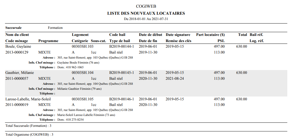 Le format détaillé fournit les informations de base et des informations complémentaires pour chaque nouveau locataire. Par ailleurs, le format détaillé permet d'afficher ou non les informations suivantes :