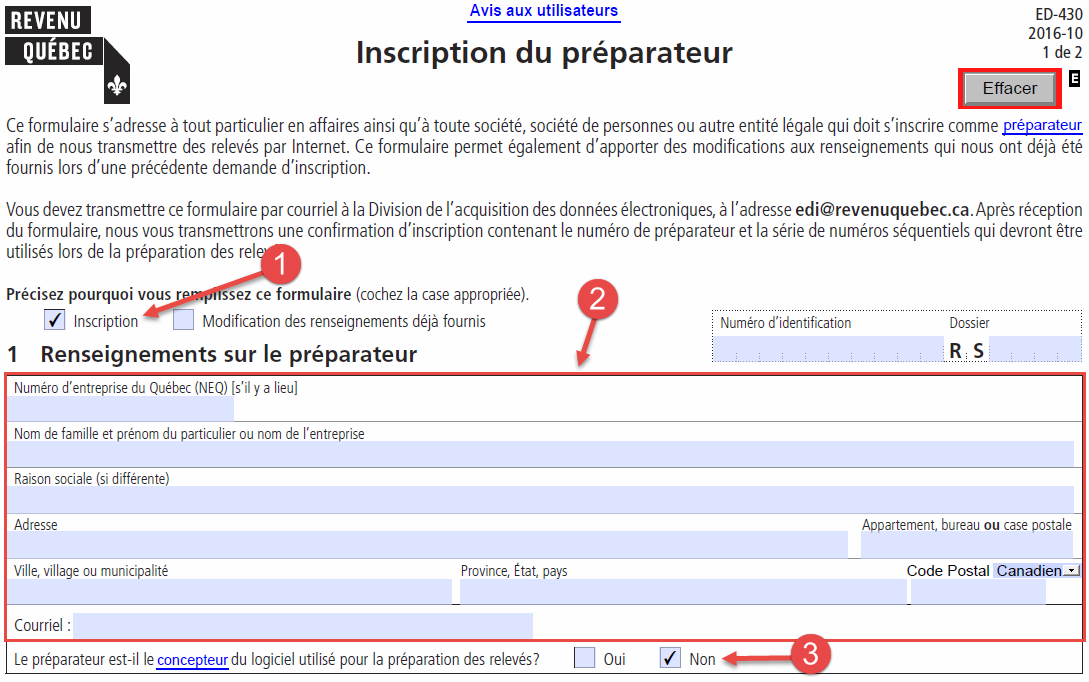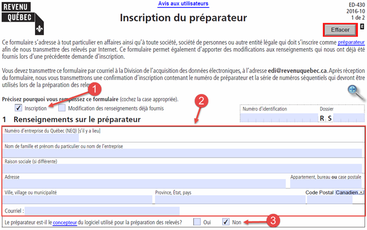 Pour inscrire votre organisme en tant que préparateur, vous devez remplir le formulaire Inscription du préparateur (ED-430) sur le site Web de Revenu Québec et transmettre le formulaire de type "PDF dynamique" de façon électronique.