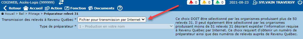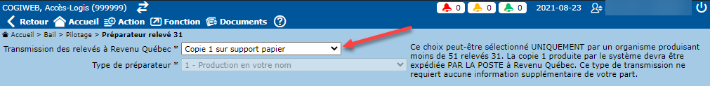 L'écran de pilotage "Préparateur relevé 31" permet d'indiquer la méthode utilisée pour la transmission des relevés 31 à Revenu Québec (support papier ou transmission par Internet). Cet écran est accessible via "Bail -> Pilotage".