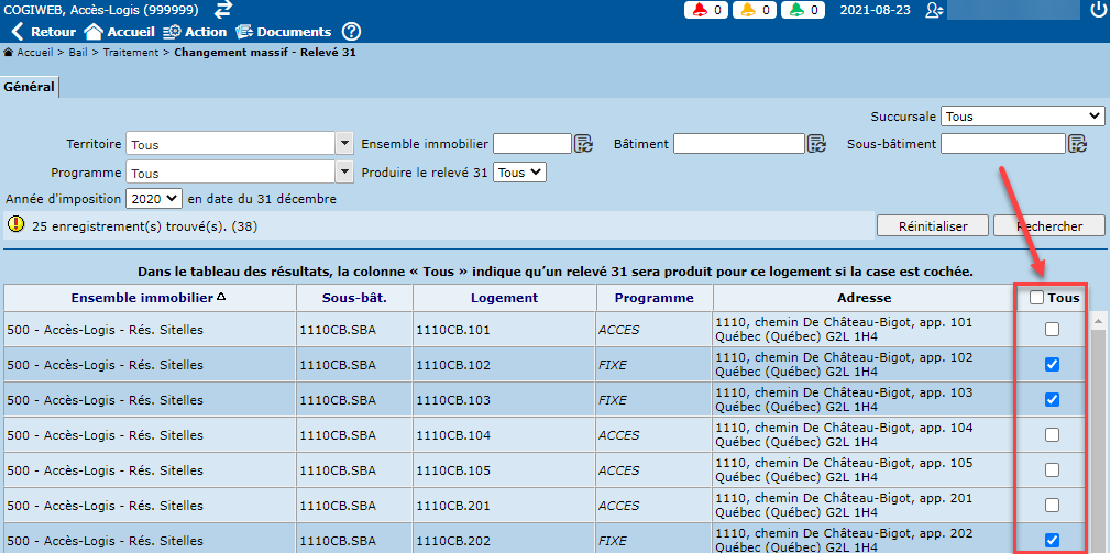 L'écran "Changement massif - Relevé 31" permet de sélectionner ou dessélectionner, de façon massive, des logements pour lesquels la production de relevés 31 est requise ou non.
