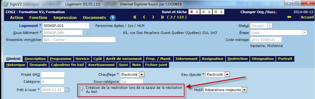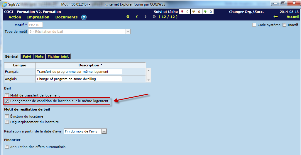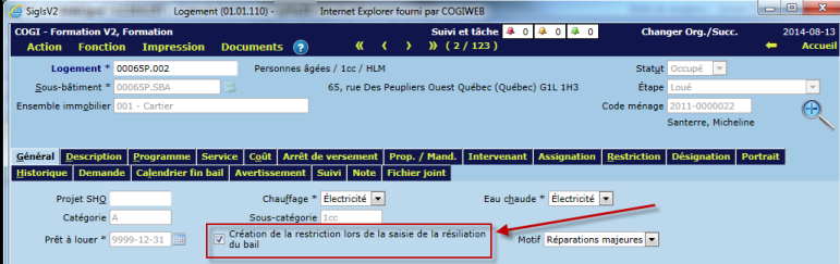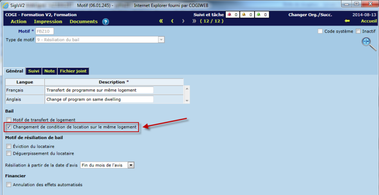 Lorsque le motif de résiliation à l'option "Changement de condition de location sur un même logement" est coché, la date de prêt à louer passe de 9999-12-31 à la date de résiliation + 1 jour.