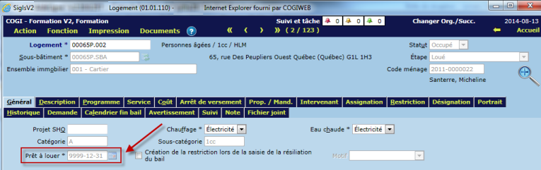 Une fois le logement occupé (bail en vigueur), la date de prêt à louer devient 9999-12-31 pour indiquer que le logement est occupé pour une période indéfinie, jusqu'à la saisie d'une résiliation pour le bail en cours.