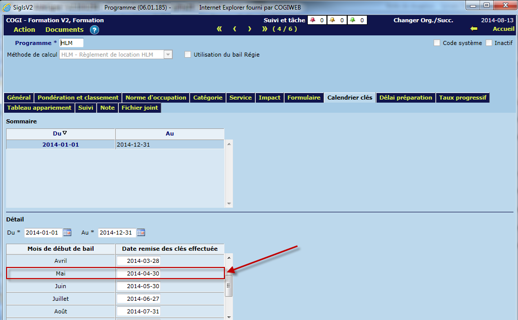 Par exemple, la date de résiliation est le 2014-04-30. La date de prêt à louer sur le logement sera 2014-05-01 et, à la création du bail pour le mois de mai, la date de remise des clés sera 2014-04-30.