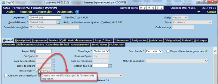 Par ailleurs, la date de prêt à louer peut être grisée (non modifiable) lorsqu'une fiche d'inspection est en cours sur le logement. Le cas échéant, une infobulle s'affiche afin d'informer l'utilisateur de la présence d'une fiche d'inspection ouverte. Tant que la fiche d'inspection n'est pas fermée, la date de prêt à louer ne peut être modifiée.
