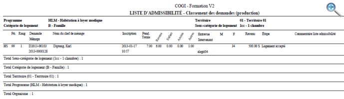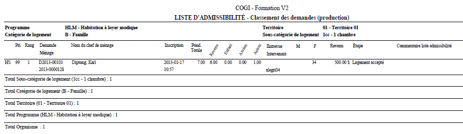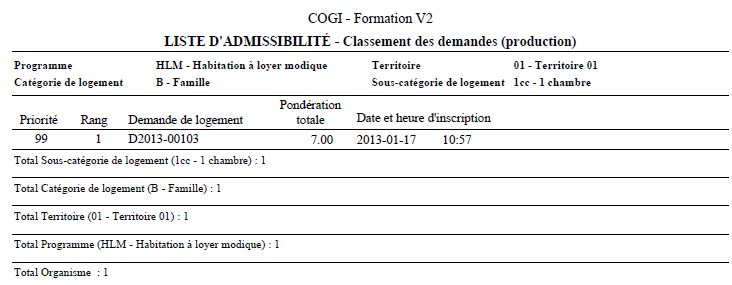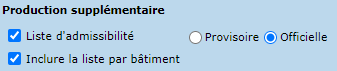 En plus de la planification du classement des demandes, le traitement permet de produire une liste d'admissibilité provisoire ou officielle. Par ailleurs, il est possible d'inclure la liste par bâtiment (à noter que cette liste ne fournit des résultats que s'il y a de l'harmonie sociale par bâtiment).
